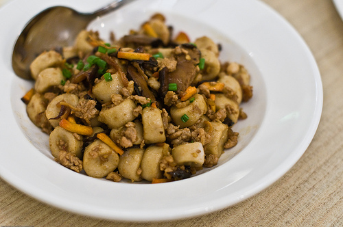 算盘子 is a mixture of yam and rice dough rolled into small rounds and lightly pressed into shapes like abacus seeds. It is best come up with other ingredients such as mushrooms, dried shrimp, fried shallot, spring onion and garlic. Depends on individual whether you wanna boiled it or fried it.. both also taste nice!